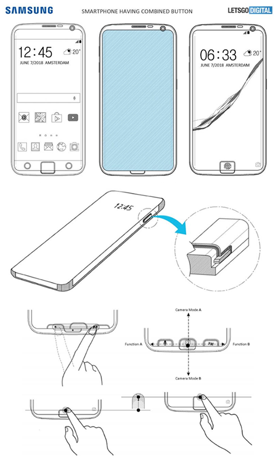 Samsung Electronics a depus un brevet la WIPO pe 29 noiembrie 2017. Brevetul a fost publicat în 7 iunie 2018 și prezintă un smartphone Samsung cu buton combinat de Acasă. Brevetul arată o nouă invenție pentru senzorul de amprentă digitală aflat sub afișaj. De asemenea, partea superioară primește o reproiectare, pentru un raport de ecran mai mare.