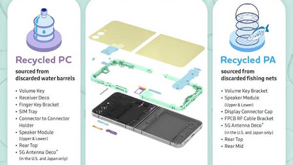 La începutul acestui an, Samsung și-a extins utilizarea inovatoare a materialelor reciclate în proiectarea produselor cu seria Galaxy S23. Atunci compania a introdus materiale noi în mai multe componente pentru telefoanele din această serie. Cu Galaxy Z Flip 5 și Z Fold 5, Samsung duce mai departe  aceste eforturi. Gigantul coreean oferă o mare varietate de materiale reciclate în mai multe componente interne și externe decât smartphone-urile anterioare din seria Galaxy Z.