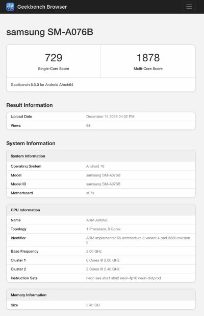 Între timp, listarea pe Geekbench sugerează că Samsung a echipat Galaxy A07 5G cu un procesor MediaTek Dimensity 6300 și 4GB de RAM. În momentul când am scris prima dată de listarea pe site-ul de referință nu știam ce procesor va avea telefonul. Dacă ne raportăm la Galaxy A07 4G, aceasta va fi cea mai mică configurație de memorie RAM, dar modelul 5G va avea și opțiuni de 6 și 8GB de RAM disponibile pe unele piețe. Vedeți mai jos ce scoruri a obținut telefonul pe Geekbench!