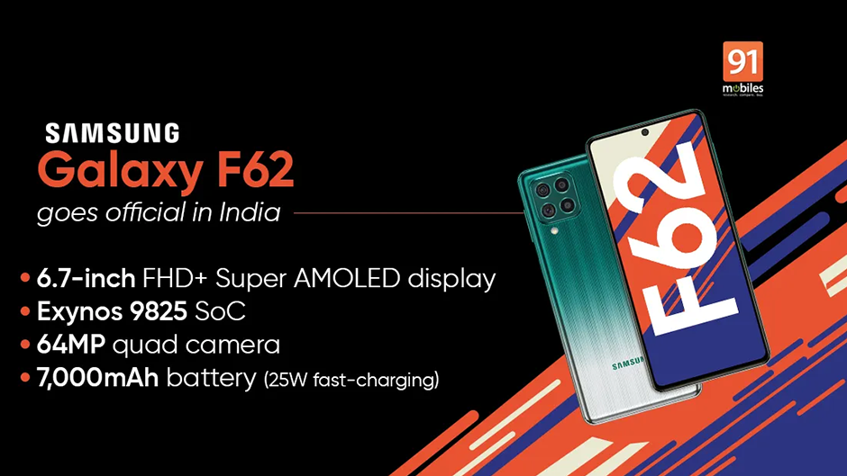 Specificațiile cheie de la Samsung Galaxy F62 includ cipset-ul Exynos 9825 care a fost găsit și pe seria Samsung Galaxy Note 10. Sistemul de operare Android 11 și interfața Samsung One UI 3.1 sunt la bord. Are o cameră foto principală de 64MP și o baterie de 7.000 mAh.