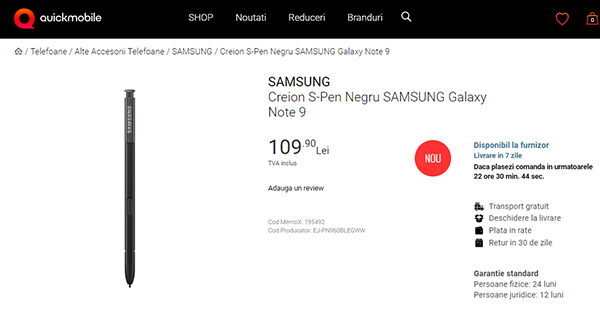 O altă noutate găsită pe site-ul QuickMobile este apariția la vânzare a unui stilou S Pen negru pentru Samsung Galaxy Note 9. Pentru acesta este afișat un preț de 110 lei, aproximativ 24 de euro.