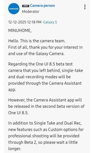 Potrivit AndroidPolice, o captură de ecran a unei interacțiuni dintre un moderator al comunității Samsung și un utilizator a fost distribuită de cunoscutul TarunVats. Potrivit moderatorului, care se presupune că face parte din echipa Samsung care se ocupă de camerele foto, funcțiile Single Take și Dual Recording vor reveni odată cu a doua versiune beta One UI 8.5, dar nu în aplicația Cameră în sine. În schimb, cele două moduri vor fi incluse în Camera Assistant, lansat ca modul Samsung Good Lock.