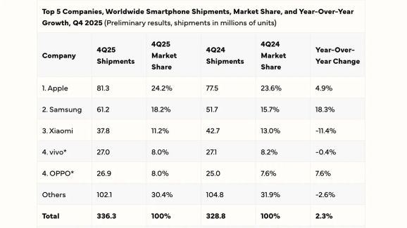 Am scris zilele trecute că Apple a depășit Samsung ca vânzări de telefoane în 2025, conform unor estimări publicate de CounterpointResearch. Acum și International Data Corporation (IDC) confirmă acest lucru. Livrările globale de smartphone-uri au crescut cu 2,3% față de anul precedent în Q4 2025, totalizând 336,3 milioane de unități.