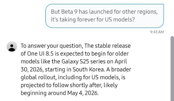 Chatbot-ul indică faptul că versiunea stabilă a One UI 8.5 este așteptată pe 30 aprilie pentru Galaxy S25. Reamintim că aceasta este data anunțată de TarunVats acum câteva zile. El specifică apoi că lansarea globală, adică în restul lumii, va avea loc pe 4 mai. Aceste date corespund în general programului de lansare al Samsung.