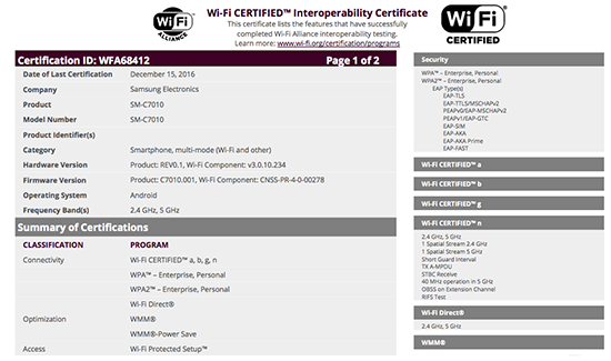 Documentele de certificare Wi-Fi (without fiber = fără fir) arată că Samsung Galaxy C7 Pro (SM-C7010) este compatibil cu Wi-Fi a / b / g / n standarde de conectivitate directă dual-band și Wi-Fi.