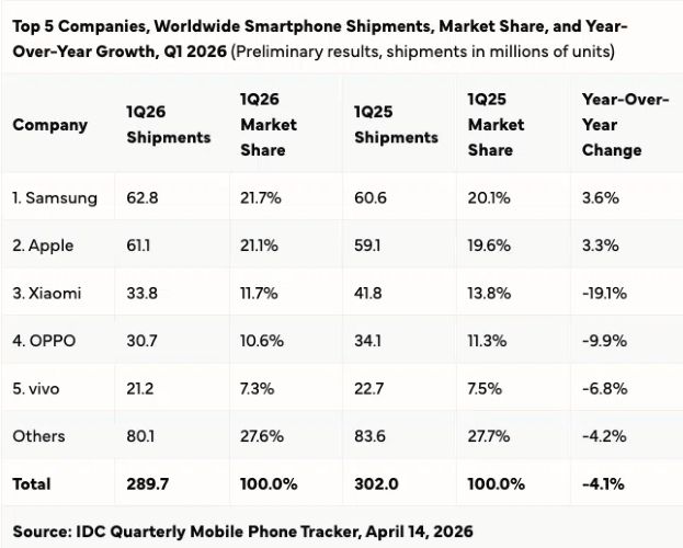 International Data Corporation (IDC) a publicat studiul său preliminar privind livrările de smartphone-uri la nivel mondial pentru primul trimestru al anului 2026. Cifrele arată o scădere a cererii de telefoane mobile în primul trimestru din acest an. Un total de 289,7 milioane de dispozitive au fost livrate în primele trei luni ale anului 2026. Cifra reprezintă o scădere de 4,1% față de aceeași perioadă a anului trecut.