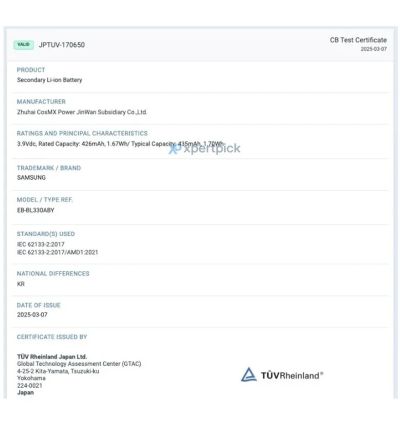 Bateria EB-BL330ABY a trecut și prin certificarea TÜV Rheinland, dezvăluind o capacitate nominală de 435mAh. Acest lucru i-ar oferi o capacitate puțin mai mare decât Galaxy Watch 7 de 44 mm (425 mAh). Cu toate acestea, în utilizarea zilnică va fi greu de observat această diferență.