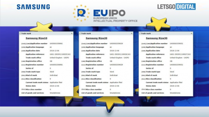 Samsung Electronics a depus trei cereri de marcă la 6 decembrie 2018 în Marea Britanie la Oficiul Proprietății Intelectuale. Acestea sunt pentru numele Samsung Rize10, Samsung Rize20 și Samsung Rize30. Toate cele trei nume de marcă sunt clasificate ca „smartphone”. Cererile de marcă au fost depuse de agentul Fieldfisher LLP din Londra, care a mai depus astfel de cereri pentru Samsung. Tot pentru numele Rize au fost depusă o cerere de marcă comercială și în Mexic.