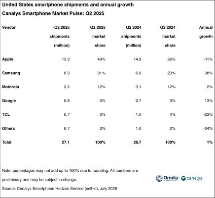 Potrivit celui mai recent studiu de piață realizat de compania Canalys, vânzările de telefoane Samsung au crescut cu 38% în SUA în Q2 2025. Aceste vânzări au făcut ca Samsung să ajungă la o cotă de piață de 31% în Statele Unite. Este totuși încă departe de Apple cu o cotă de aproape 50%.