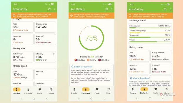 Fila Încărcare a dispozitivului din aplicația terță Accubattery arată câte cicluri necesită fiecare încărcare și oferă informații despre uzura și eficiența bateriei. Fila Descărcare afișează starea curentă, inclusiv vitezele de descărcare la pornirea și oprirea ecranului și detalii detaliate despre utilizarea bateriei.
