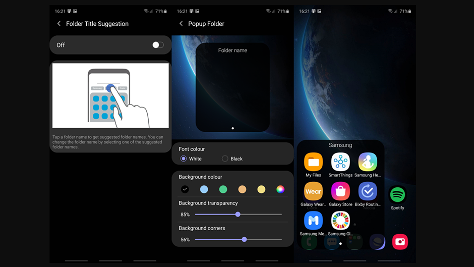 Secțiunea Folder conține opțiuni pentru a personaliza folderele ecranului de domiciliu. Puteți să le faceți pop-up într-o fereastră mai mică, în loc să le faceți să ocupe întregul ecran de start. Fereastra pop-up a folderului poate fi personalizată cu diferite culori de fundal și setări de transparență. Puteți face chiar și colțurile unui folder mai rotunde sau mai pătrate. O altă completare nouă vă oferă sugestii despre titlul folderului, alimentate de învățarea automată. Cu ajutorul învățării automate, Home Up sugerează automat numele și numește folderul în consecință. Cu toate acestea, această caracteristică este dezactivată în mod implicit atunci când utilizați folderele pop-up menționate anterior. Funcționează numai cu setările implicite ale folderului One UI.